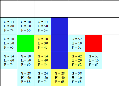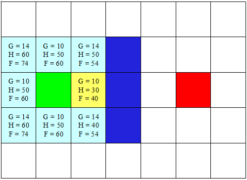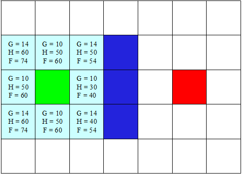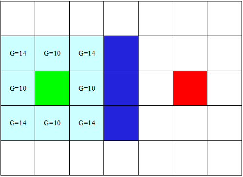 Kita asumsikan setiap langkah dari hijau adalah legal baik vertikal, horizontal, maupun diagonal dengan catatan tidak membentur tembok. Setiap langkah yang diizinkan kita berikan nilai G dimana G adalah cost atau biaya dalam setiap langkah. Dalam kasus ini kita akan berikan nilai 10 untuk setiap langkah vertikal maupun horizontal, dan 14 untuk diagonal. Nilai 14 kita dapatkan dari perhitungan pitagoras dimana 14,1421 = sqrt(sqr(10)+sqr(10)). Hasil data nilai G ini selanjutnya kita gambarkan sbb :