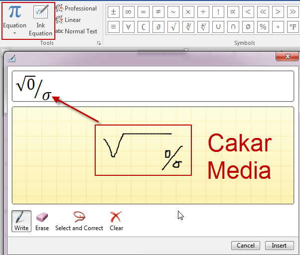 4. Fungsi Equation, Umumnya fungsi ini digunakan untuk membuat berbagai macam simbol-simbol Matematika, Sebenarnya diversi sebelumnya Ms. Word sudah memiliki fungsi ini, akan tetapi di versi Office 2016 ini lebih dinamis dan interaktif, dimana pengguna Office Word bisa menuliskan symbol matimatika layaknya menggunaka Ballpoint (jika menggunakan layar sentuh) jika tidak menggunakan layar sentuh anda juga bisa menggunakannya dengan kursor Mouse yang nantinya hasil tulisan simbol anda akan di konversi menjadi teks yang lebih rapih.
